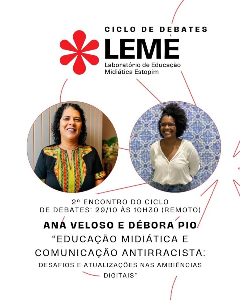 28 de outubro de 2025Na quarta-feira, dia 29 de outubro, Debora Pio, pesquisadora do MediaLab.UFRJ, participa do 2º encontro do ciclo de debates LEME (Laboratório de Educação Midiática Estopim). A conversa será sobre "Educação Midiática e Comunicação Antirracista: desafios e atualizações nas ambiências digitais". Além de Debora, a mesa também conta com Ana Veloso, professora da Pós Graduação em Comunicação da Universidade Federal de…
